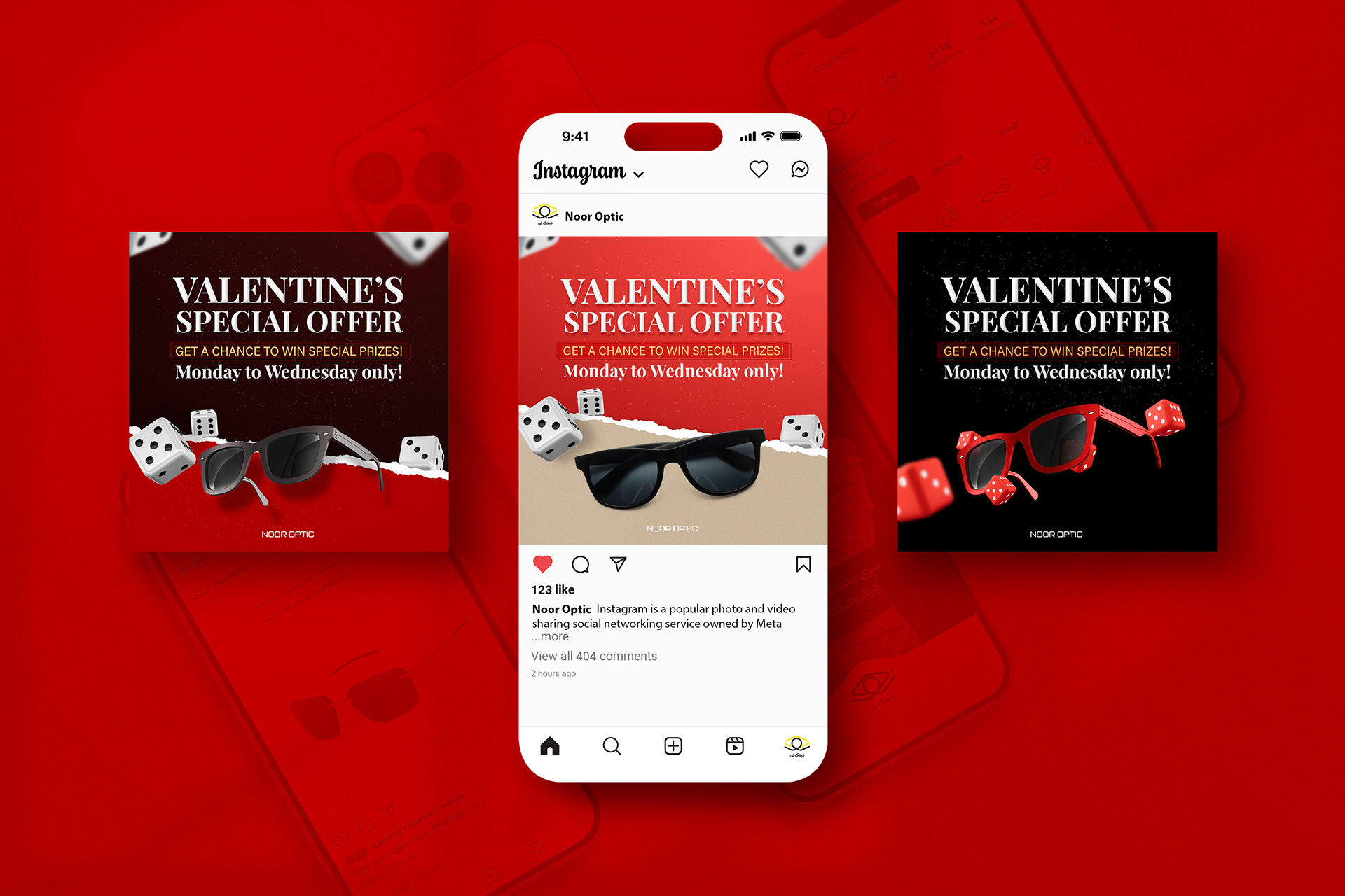 Valentine's Day campaign posts. All posts and stories were designed to convey the whole process of the sale's format to the audience, which was throwing a dice twice so that the total number would be the percentage of the sale on each product.