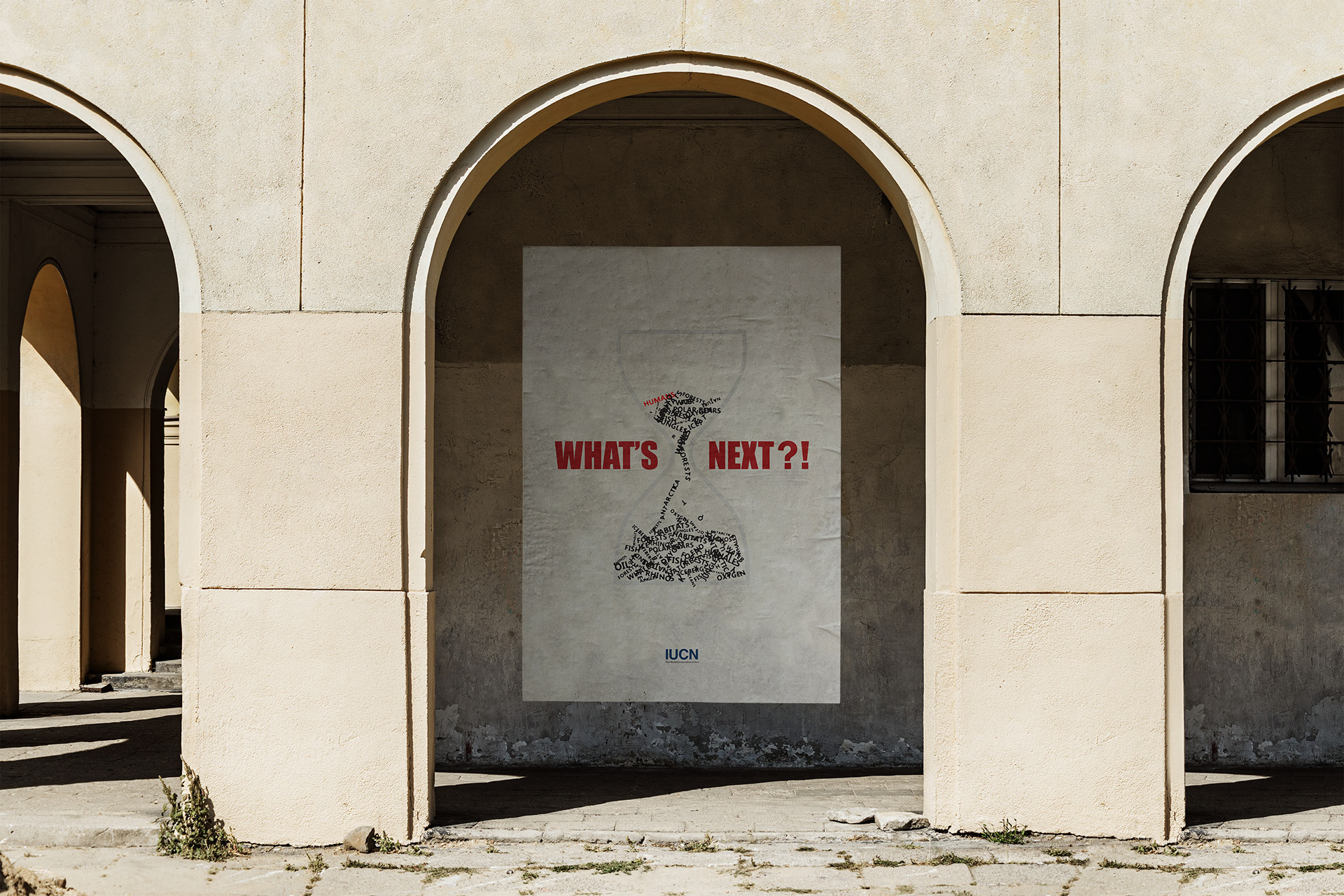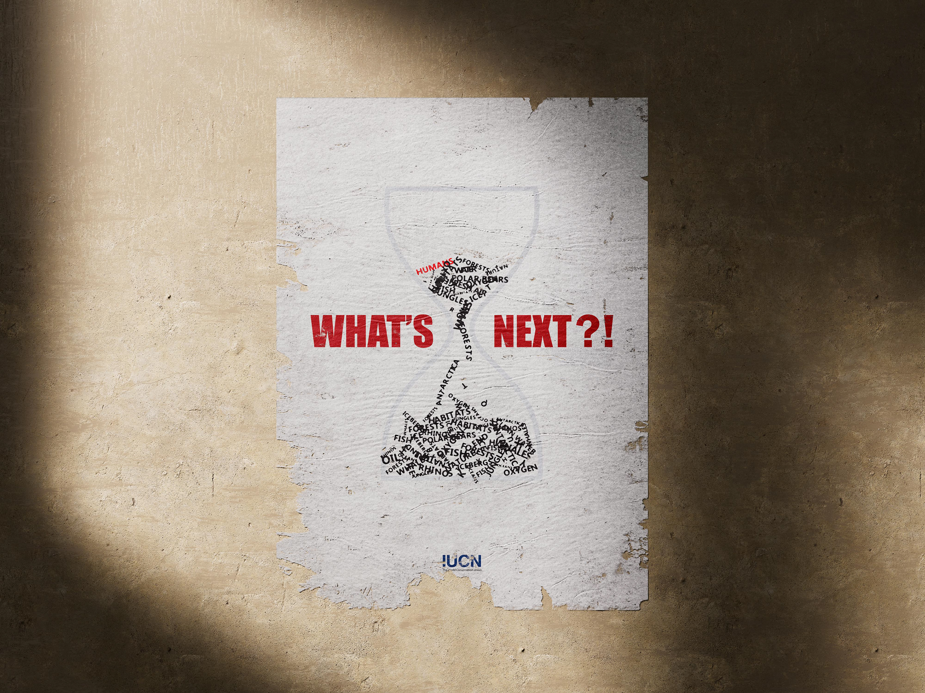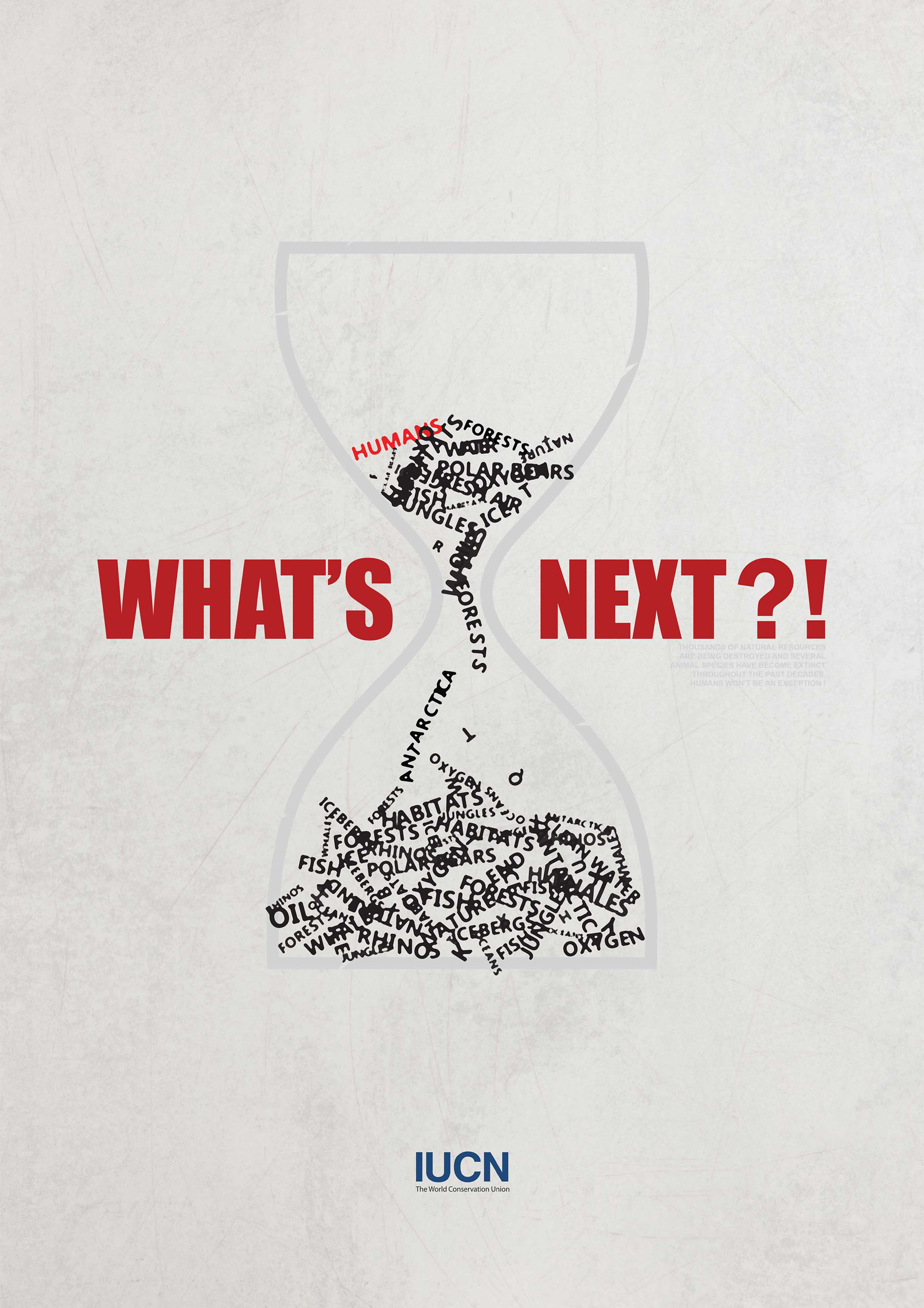 In this design, the title WHAT'S NEXT refers to many natural-oriented things such as endangered speceis and natural resources that are falling into the buttom half of a cracked hourglass, indicating a warning about what is being destroyed by humans.
